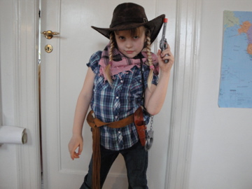Det var en western udklædningsfest, og endnu et tegn på at hun er blevet en stor pige er, at hun ikke valgte at være den feminine indianerprinsesse. Nej, hun skulle være herrefarlig cowboy. Jeg var hele Rødovrecenteret rundt for at finde den rette skjorte og tørklæde, i ren taknemmelighed over at hun ikke ville være lille fin squaw. Og er I klar over, hvor svært det er at finde et sejt cowboy tørklæde for tiden? Moden er jo gigantiske kæmpe tørklæder med blomster og mønstre og alt muligt, der ikke er særlig western.